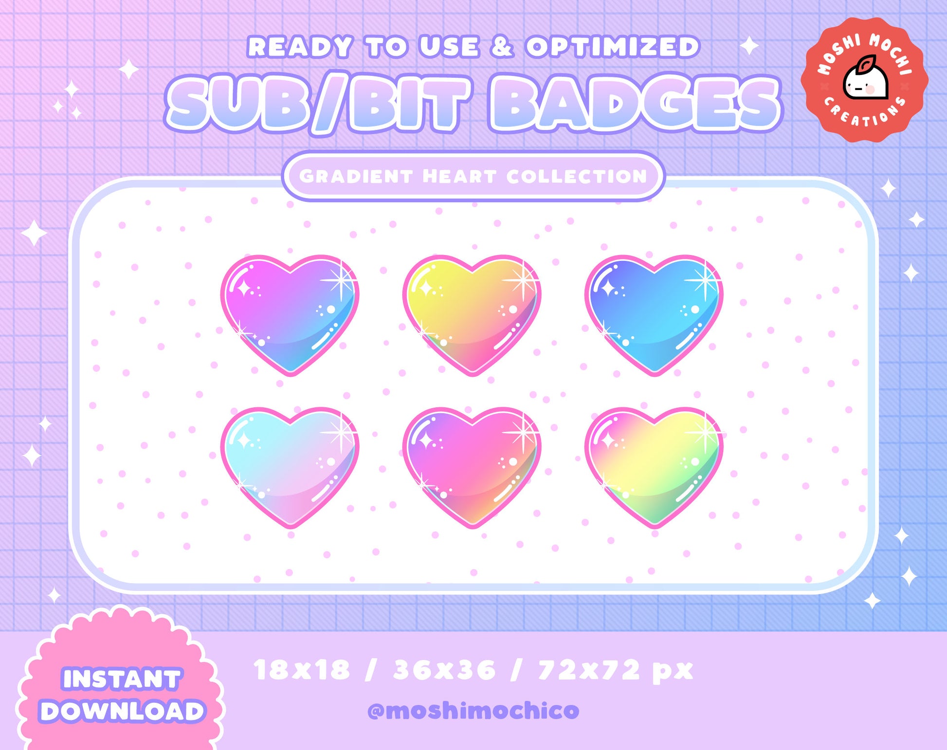 This set includes 6 sparkle gradient heart sub/bit badges.