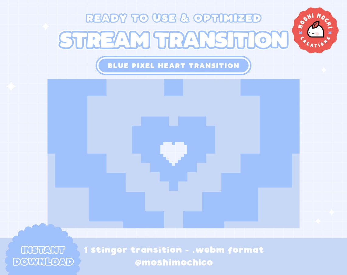 This listing includes 1 baby blue expanding pixel heart stinger transition.
